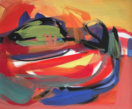 The artist paints directly usually with no preliminary sketching on the canvas, which she stretches for herself. Her favourite technique is acrylic but her works on paper also use watercolour, ink and chalk. As quickly becomes apparent, she works with no photographic templates.