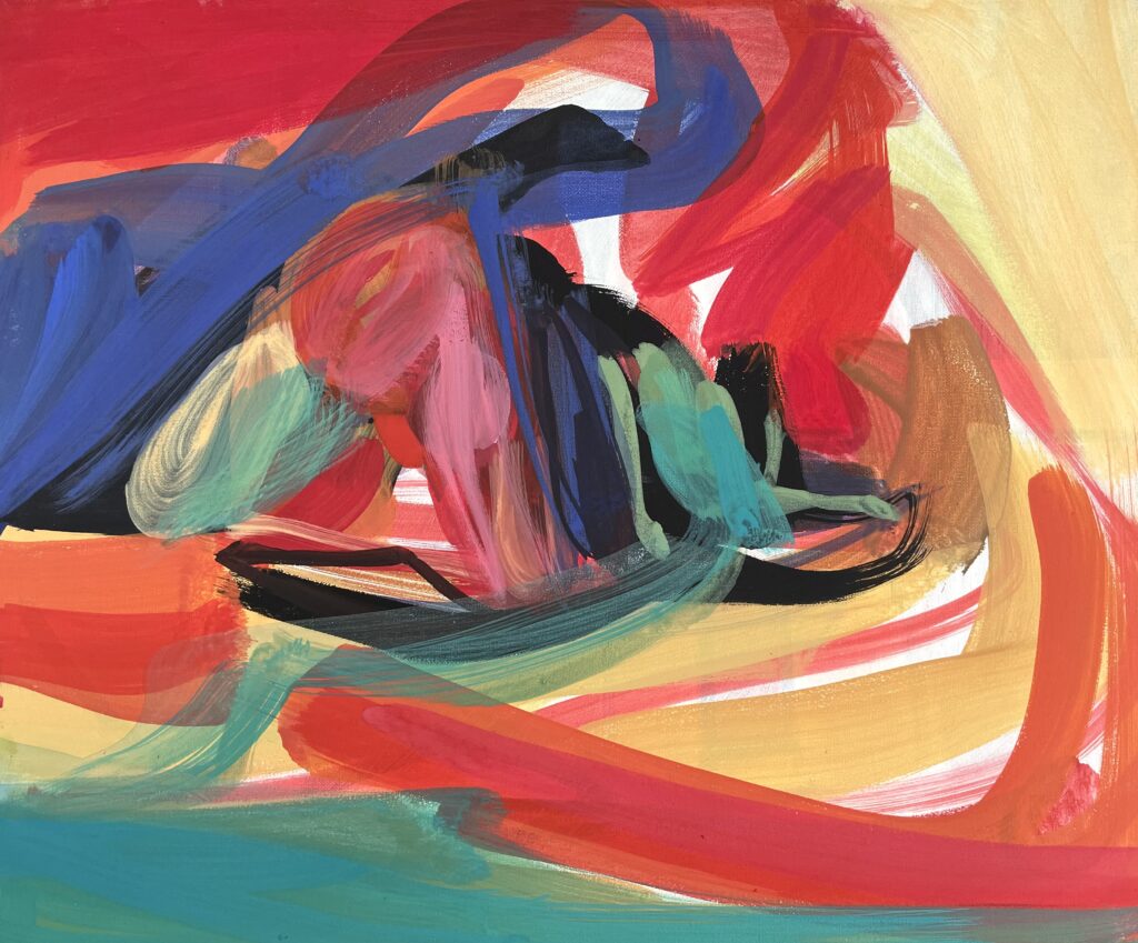 The artist paints directly usually with no preliminary sketching on the canvas, which she stretches for herself. Her favourite technique is acrylic but her works on paper also use watercolour, ink and chalk. As quickly becomes apparent, she works with no photographic templates.